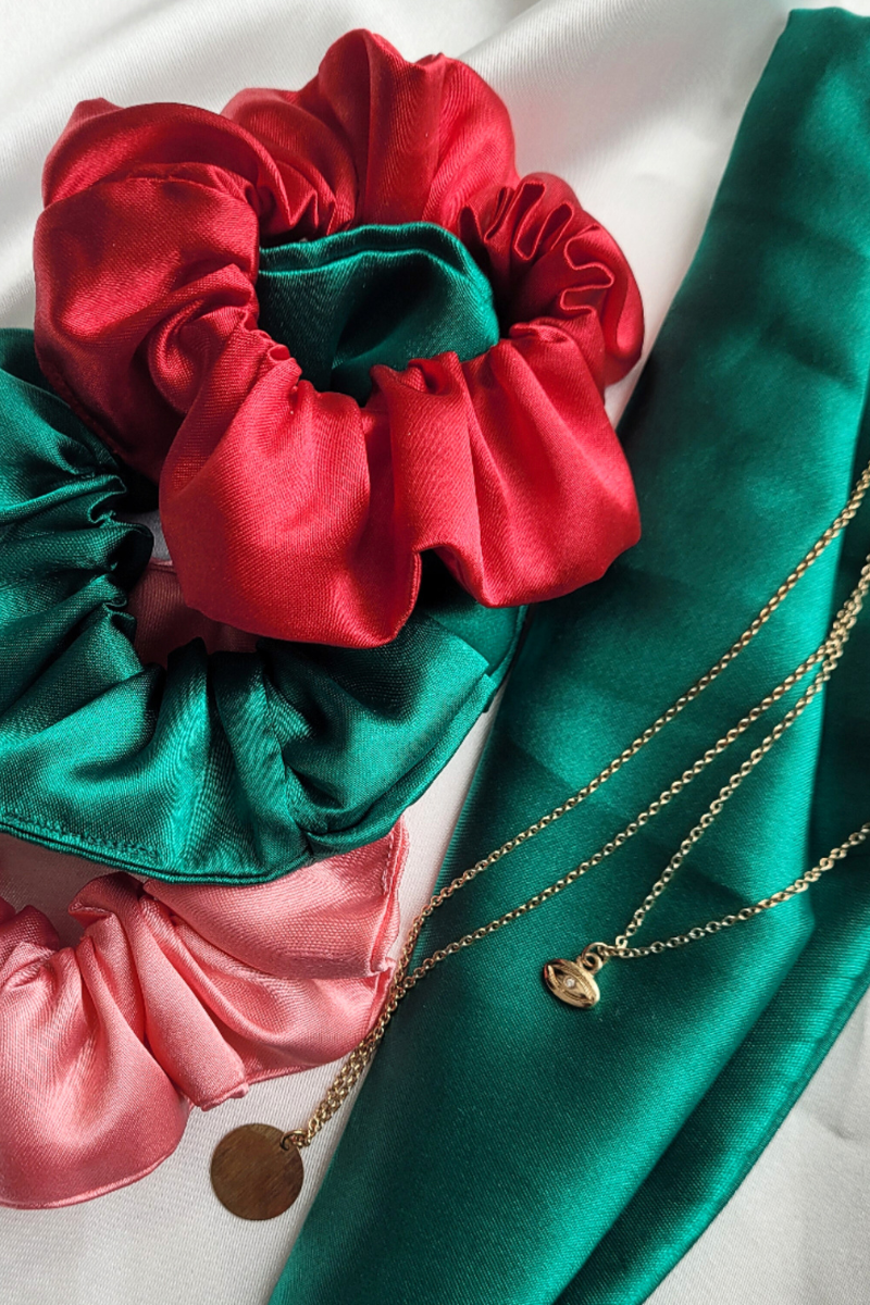 Complete your scrunchie with a scarf add-on. The removable scarf tie brings endless styling possibilities.